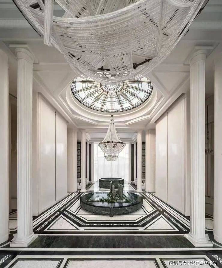 在门庭的环岛空间,景墙面采用中轴对称的设计布局,定制了奢石镶嵌装饰,将曲面艺术与经典石器之美圆融交融。