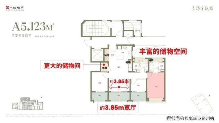 户型设计上,中间套客厅拥有3.85米的开阔面宽,并配备同级更大尺度的储藏间及丰富储物功能,兼顾采光、收纳等实用需求。