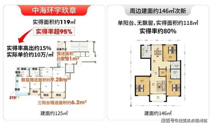环宇玖章125户型实得率超95%,而宝华项目实得率仅约80%。按同等实用面积折算,环宇玖章实际单价就更划算,仅约10万/㎡。