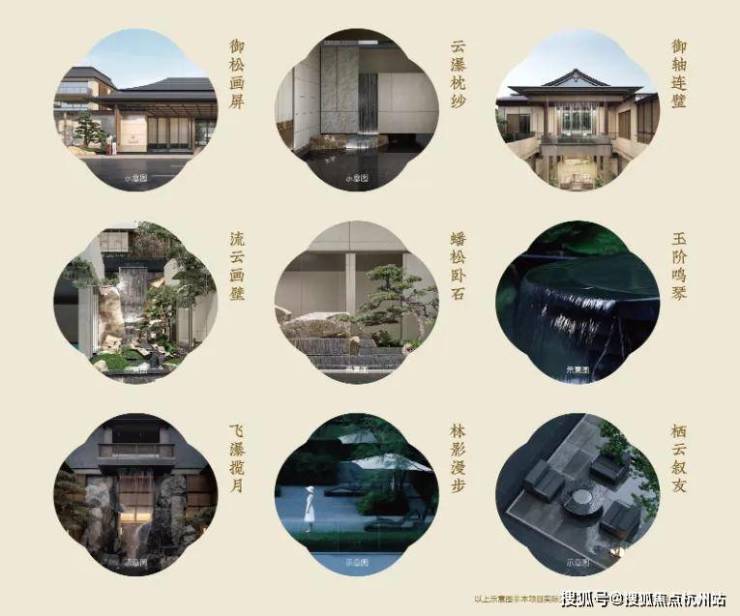 御松画屏——云瀑枕纱——御轴连璧——流云画壁——蟠松卧石——玉阶鸣琴——飞瀑揽月——林影漫步——栖云叙友