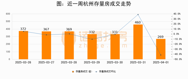 从存量房来看,2025年04月01日杭州存量房单日成交269套,比昨日减少191套,环比下降41.5%。从近一周存量房成交来看,杭州存量房日均成交套数为357套,04月01日单日成交269套,低于近一周平均水平24.6%。