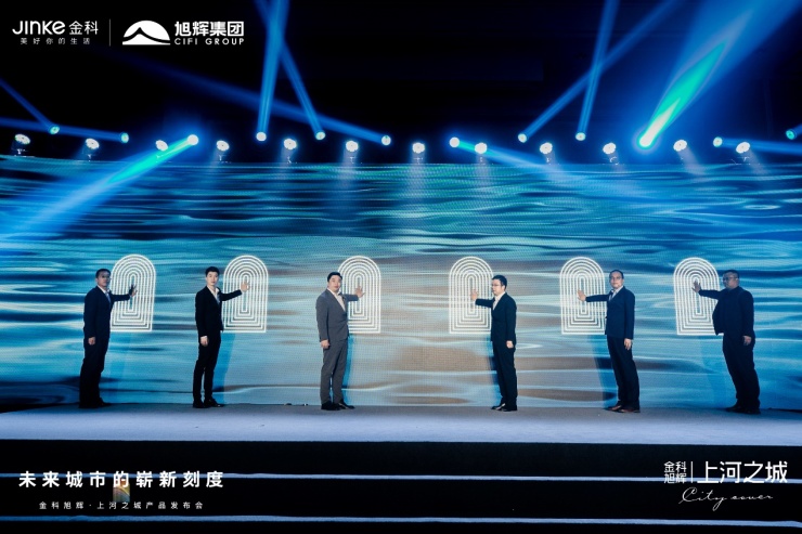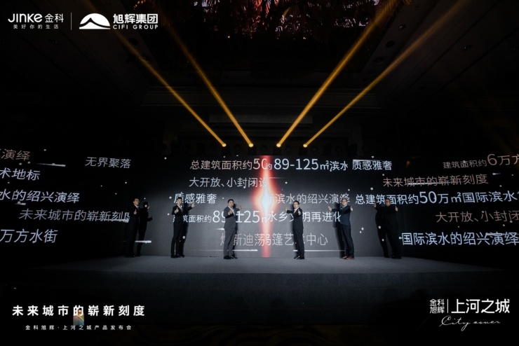 结束之际,各位领导一起走向主席台中央,产品发布仪式开启,共同点亮了金科旭辉·上河之城的美好时刻。