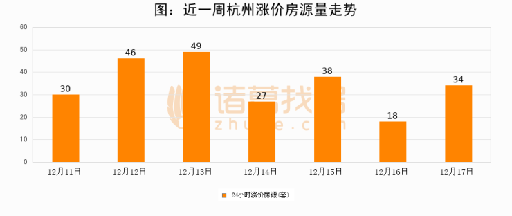 根据诸葛找房数据显示,杭州24小时涨价房源量为34套,较12月16日增加16套,环比上涨88.9%。与此同时,涨价房源占比小幅扩大,业主信心有所提升。