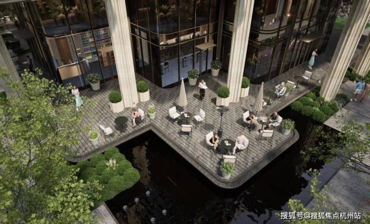 西侧退让28米,打造沿江延绵200米长廊艺术花园,围绕三栋沿江建筑,低区被景观环绕。