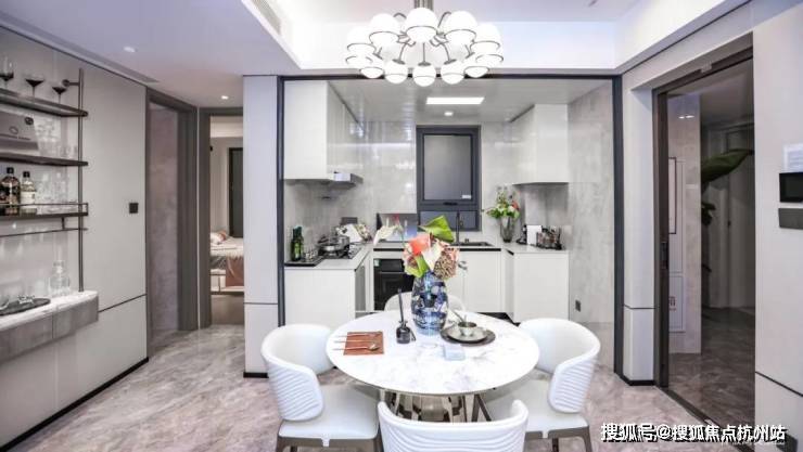LDKG设计, 让客、餐、厨、阳台四个空间打破传统布局中的“隔阂”,几个功能区独立又互通,将空间功能进一步放大。
