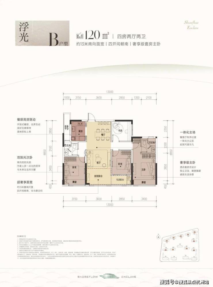 这款户型堪称四开间朝南的“流量王者”, 南向面宽约13米,双联阳台+双飘窗 设计,视野和采光优秀; 套房主卧、双阳光次卧 ,颇有大平层的气势。