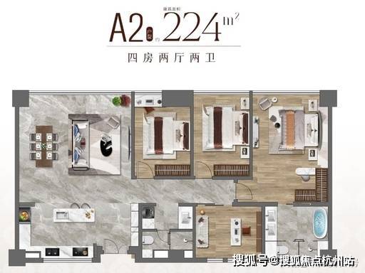 A2 户型:建面约 224㎡,四房两厅两卫,四开间朝南,双阳台,餐客一体,空间奢阔