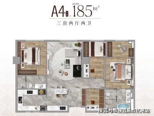 A4 户型:建面约 185㎡,三房两厅两卫,经典方正布局,动静分区,主卧套房设计