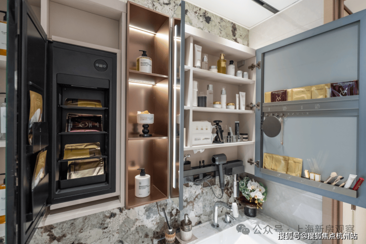 卫浴: 镜柜内置分区、卫浴柜斜翻抽等设计,为女主人量身定制。美妆灯与抽拉龙头的 “ 感官SPA” 系统,将洗漱升级为一场全方位的护理体验。