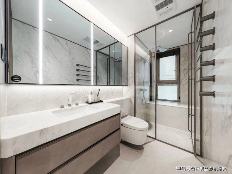 卫浴:劳芬智能马桶、当代花洒 / 五金、劳芬浴缸,三卫全配智能马桶 + 加热毛巾架。
