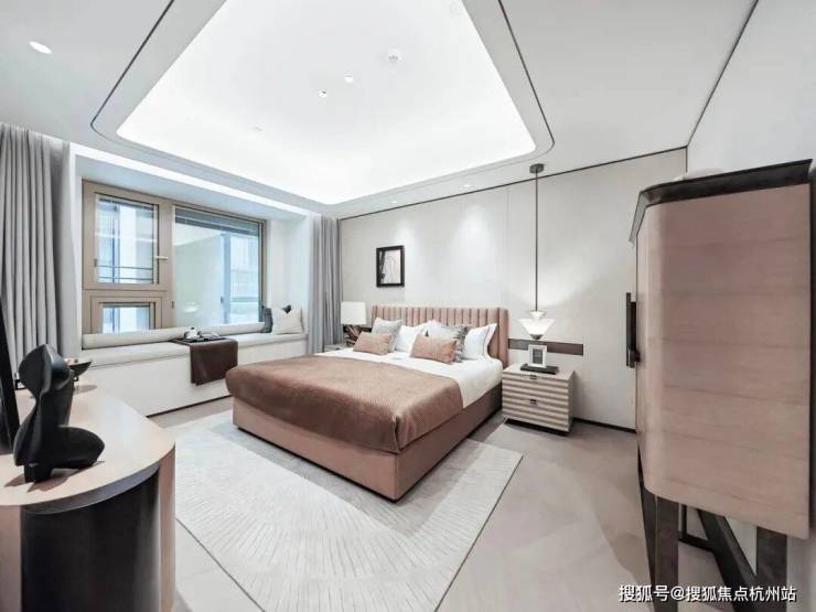 主卧套房超 45㎡,带步入式衣帽间 + 270° 飘窗 + 独立卫浴(双台盆 + 浴缸 + 淋浴)。