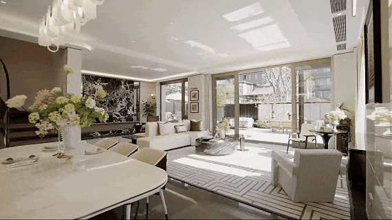 走进约 258㎡联排样板间,便能感受到空间的阔绰与尊崇:一层约3.6m层高,让室内空间尽显通透,告别压抑;客厅大面宽设计,让阳光与园林景观自然入户,将窗外风光化作室内画卷。