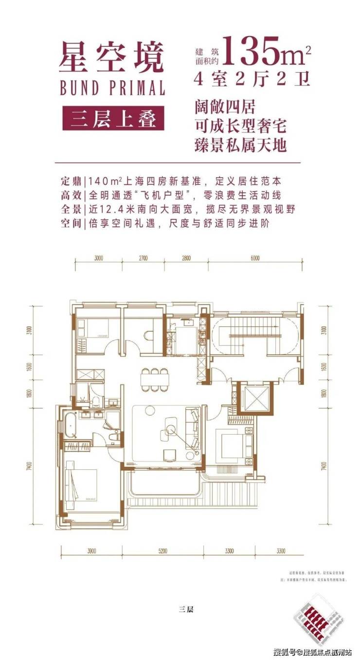建面约134㎡4房2厅2卫(三层上叠):