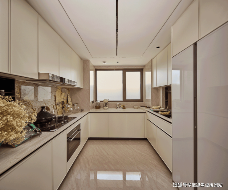 b.U 型厨房更创新采用上海首个高低台设计,既解决下厨弯腰痛点,三面台均分还能拓展操作空间。