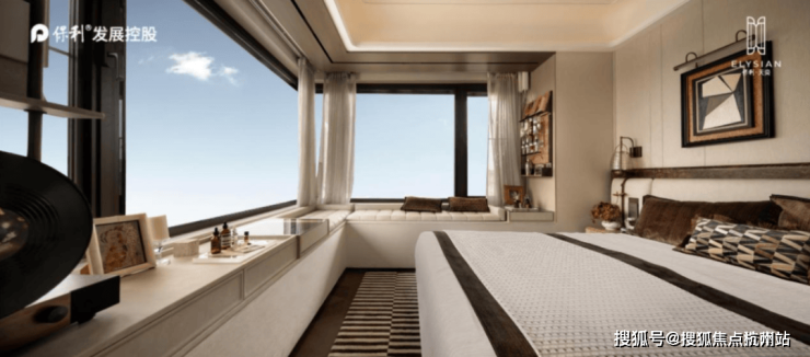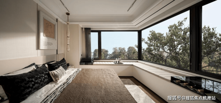 e.就连主卧也暗藏惊喜,约 270° 无柱式转角飘窗搭配双面采光的卫生间,让居住更澄澈舒心。