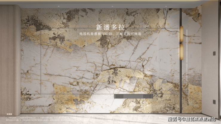 充分考虑业主的个性化需求,在电视背景板提供了新潘多拉、云中翡翠、弗朗明戈金三种结晶釉面岩板选择,成本更高,施工难度也更大。