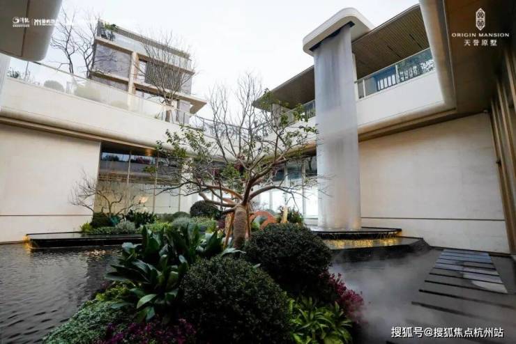 项目打造的下沉式庭院会所,是一个充满设计感的“精神私域”。它并非简单的健身房或会客厅,而是一个将功能与美学融为一体的艺术空间。 约10米落差的金属挂帘流水瀑布, 成为庭院中的视觉焦点,姿态优美的 羽毛枫 与 黑金沙花岗岩 树池相映成趣,让每一次步入都成为一场意境漫游。