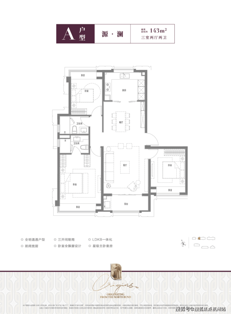 建面约143m²3房2厅2卫:格局上做到三开间朝南+南北通透,让业主起居之间沐浴更多阳光。