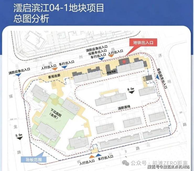 项目共设三个人行出入口、两个车行出入口及两个消防应急入口。主要出入口位于地块北侧的德州路,南侧耀川路同时设置一处人行及一处车行出入口。东侧济明路设有非机动车出入口。此外,值得注意的是,地块东北侧沿街面设置了规划中的地铁19号线德州路站出入口,业主可通过景观连廊便捷出行。