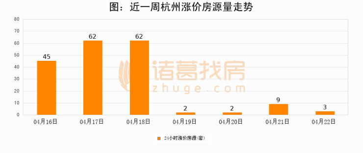 根据诸葛找房数据显示,杭州24小时涨价房源量为3套,较04月21日减少6套,环比下降66.7%。与此同时,涨价房源占比小幅回落,对于购房者来说是一个入市窗口期,购房者可抓住时机入市。