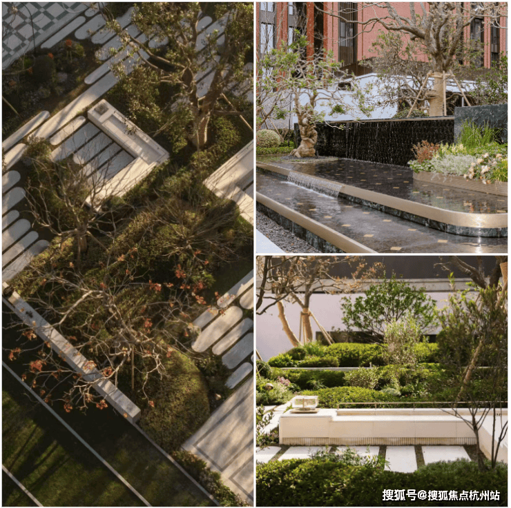 作为未来主入口的水畔之汀,则以海派弧形收边延续建筑风格,幻影蓝流水墙、普拉达绿景墙与奢金影灯形成撞色视觉焦点,中央更移植了百年桩景红果冬青与进口红枫,一步一景间皆是仪式感。