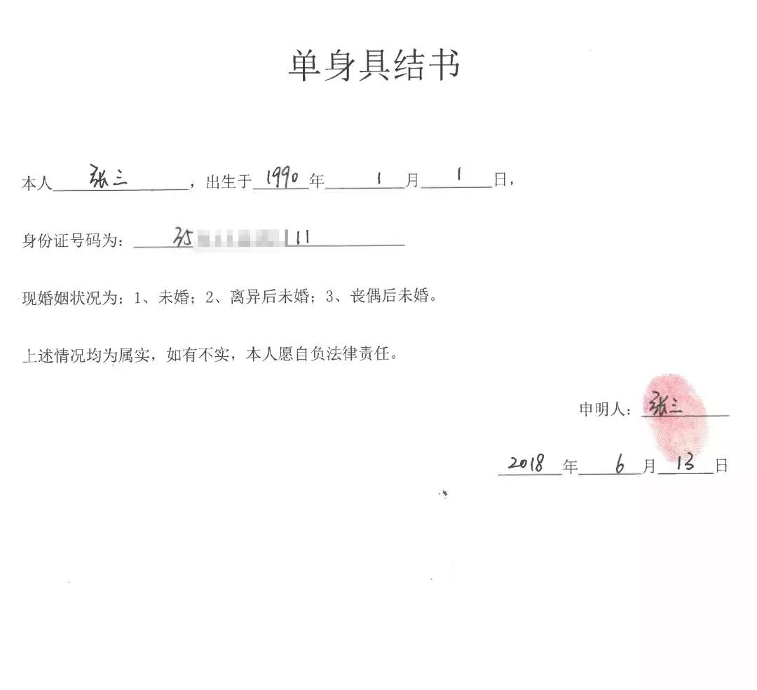 (单身证明可参考如下模板打印一份,并签字按手印即可。)