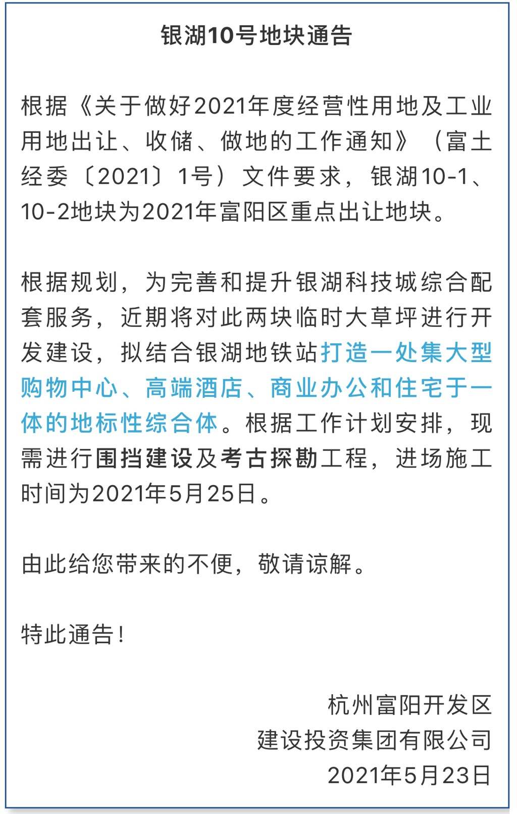 近日,《富阳日报》通告银湖科技城两块林施大草坪将开发建设一处地标性综合体,其中,包含大型的购物中心、高端酒店、商业办公以及住宅等多种业态。