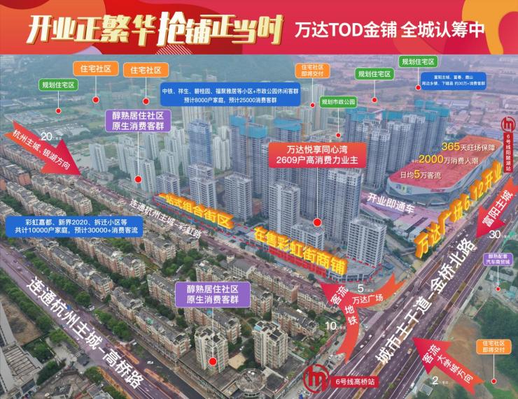 在大交通、大基建大杭州框架下,随着地铁6号线、彩虹快速路、杭州二绕等建成通车,富阳晋级杭州新城南。作为杭州新城南门户,亦是富阳融杭桥头堡, 万达商圈坐拥万达广场、万达金街三大主题街区,万达同心湾高品质大型居住社区,以富阳新中心的地标存在,价值日益凸显,伴随着城市主干道金桥北路的建成通车,尤其是万达商铺,更是火热。