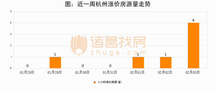 根据诸葛找房数据显示,杭州24小时涨价房源量为4套,较02月02日增加3套,环比上涨300%。与此同时,涨价房源占比小幅扩大,业主信心有所提升。
