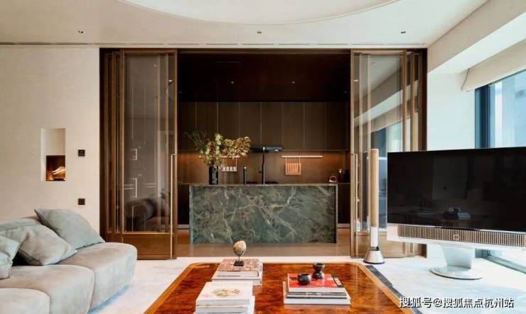 龙盛荟馆的接待处设计:空间讲究对称性、秩序感,暗绿纹哑光、温润的石材+仿铜金属板,调性和仪式感极佳,家具的选品又富有居家轻松氛围,有种俱乐部的感觉!