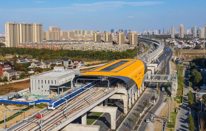 试跑中的城铁列车从杭州临平区境内的余杭高铁站至海宁境内的浙大国际校区站,途经8个高架站,4个地下站,以速度目标值120公里/小时试跑。
