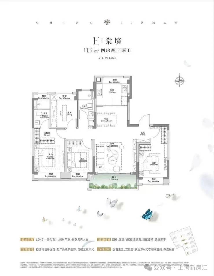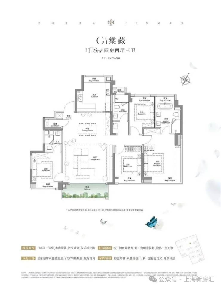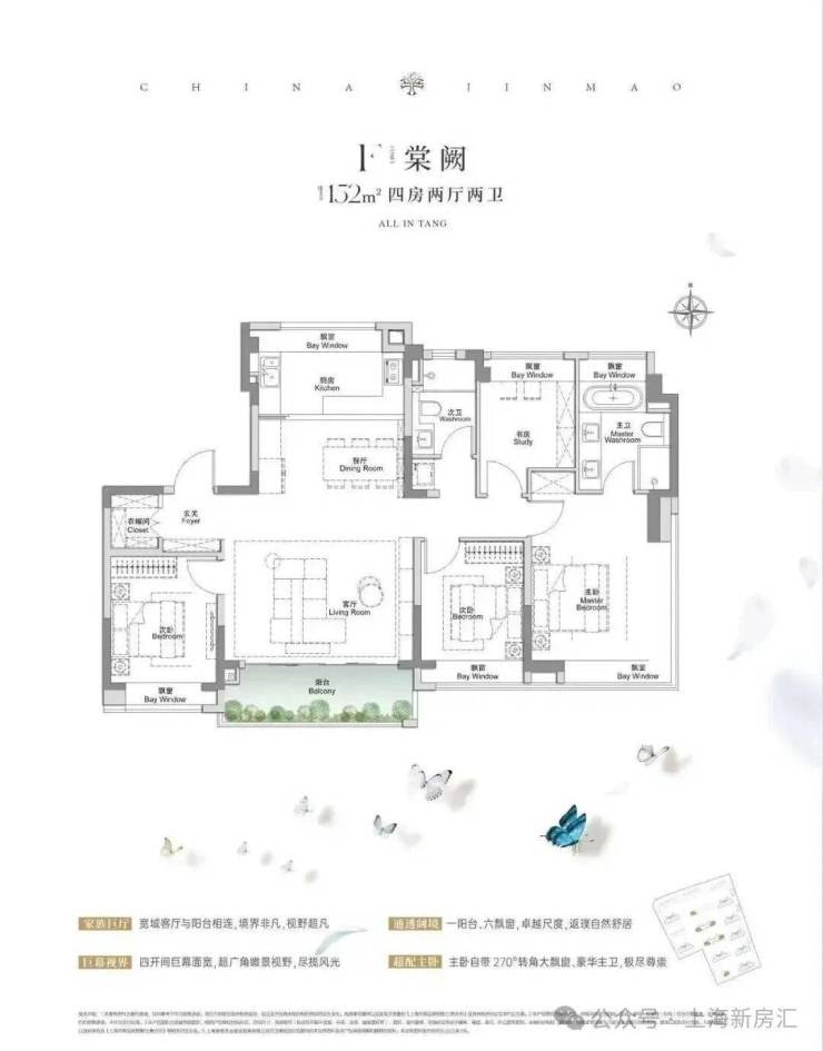 建面约117㎡3房2厅2卫 ,做到了 3+1开间朝南+5个飘窗+主卧套房设计+270°转角飘窗, 所有的尺度都有进一步提升。