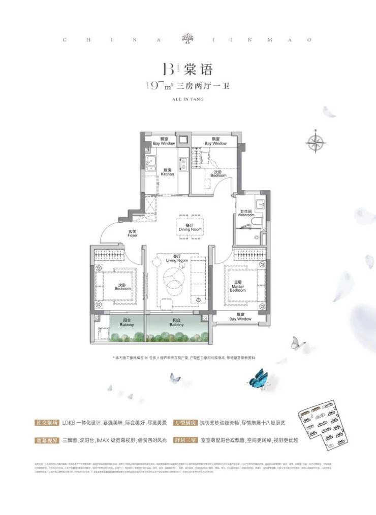 建面约97㎡3房2厅1卫 ,户型 三开间朝南、再加上“3个飘窗+双面阳台系统” ,不管是采光、视野、通风、私密性,还是实用性都十分出色。