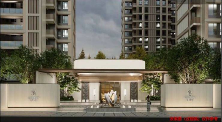 约32米气派门厅 ,入口采用 三重弧形石材墙体+圆角幻彩穿孔顶,四重酒店式归家厅堂, 让每一次归家都充满仪式感。