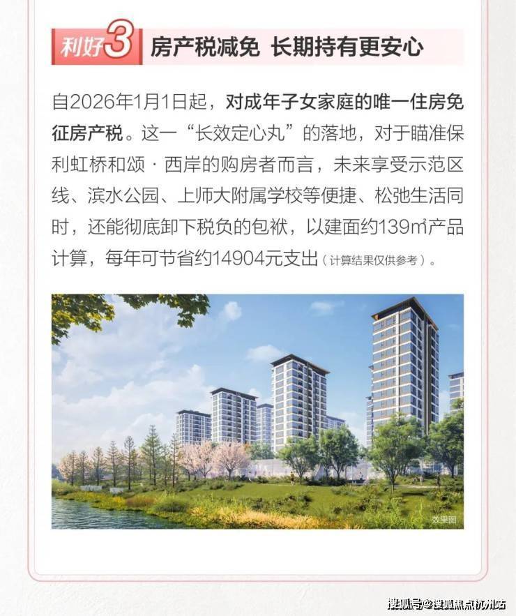 对成年子女家庭的唯一住房免征房产税 。 这一“长效定心丸”的落地,对于瞄准保利虹桥和颂·西岸的购房者而言,未来享受示范区线、滨水公园、 上师大附属学校 等便捷、松弛生活同时,还能彻底卸下税负的包袱,以建面约139㎡产品计算,每年可节省约14904元支出(计算结果仅供参考)。