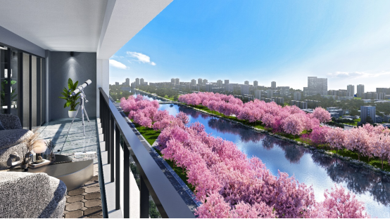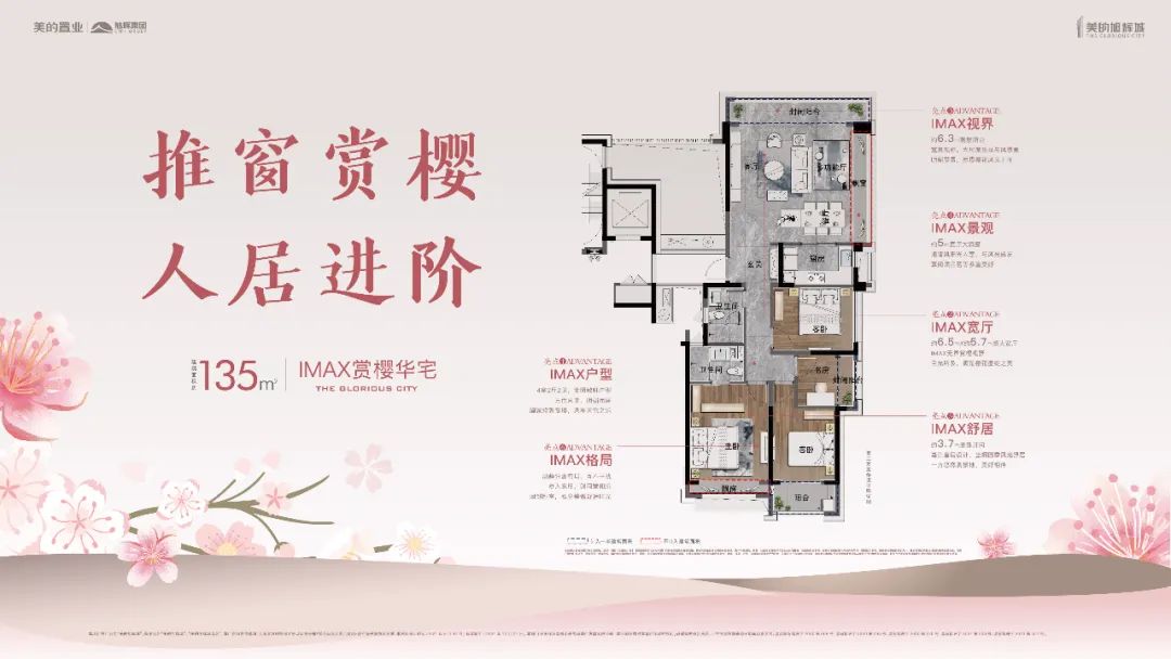 示意图春暖花开时,看樱花与繁华与共。美的旭辉城最为耀目的建面约135㎡IMAX赏樱户型,动静分离的布局,四室舒居,充分保证了每一位业主家人的休憩时间;约6.3米观景阳台,拥享大尺度的采光和风景面;打造超大宽厅里,并配置约5米的景观飘窗,推窗见景,目光所及满是樱花盛绽的美;套房式主卧约3.7米开间,独立视野,惬赏春时樱景。