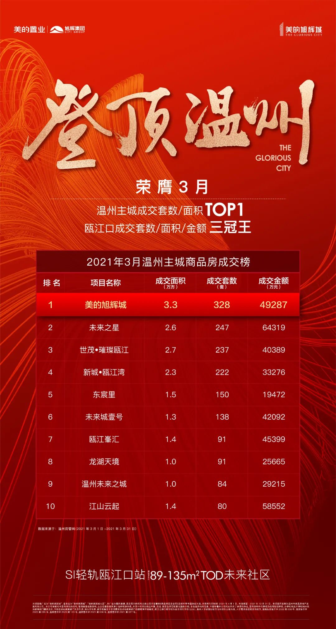 每一次亮相,都是楼市头条;每一次开盘,都是分秒竞藏。美的旭辉城的五次开盘,始终保持着火爆的热度与抢藏的速度。3月底,美的旭辉城五期火热开盘,现场座无虚席,盛况空前。在全城购房者的火热聚焦下,美的旭辉城再次创下热销奇绩,荣膺3月温州主城成交套数/面积TOP1,以及瓯江口成交套数/面积/金额三冠王!(数据来源于温州房管网)