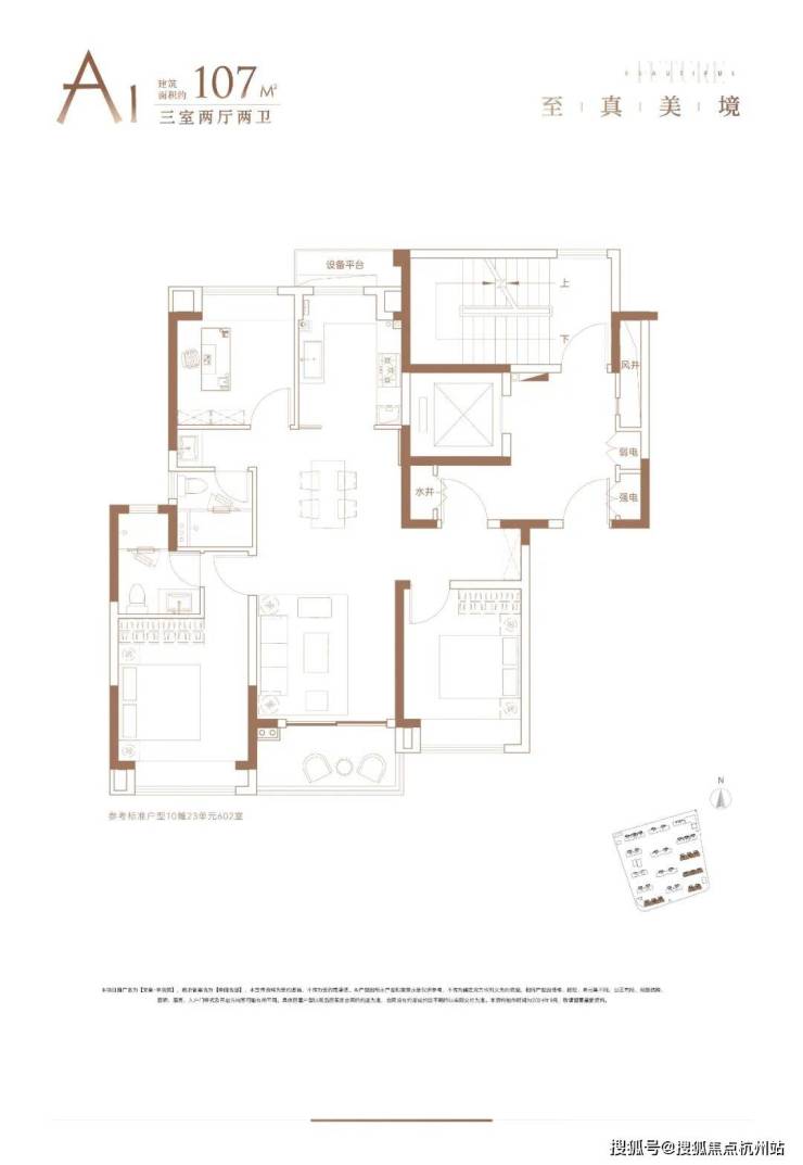 建面约107㎡3房2厅2卫户型,飞机户型+无连廊设计,做到空间0浪费,超高得房率,尺度感非常惊人。