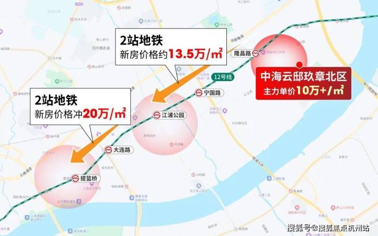我们沿着地铁线路看价格,项目出发2站地铁就是江浦公园,这里的新房已经要约13.5万/㎡。相比云邸玖章10万+/㎡的单价,地铁2站贵3万/㎡,安全垫不言而喻!