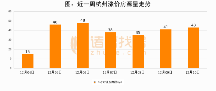 根据诸葛找房数据显示,杭州24小时涨价房源量为43套,较12月09日增加2套,环比上涨4.9%。与此同时,涨价房源占比小幅扩大,业主信心有所提升。